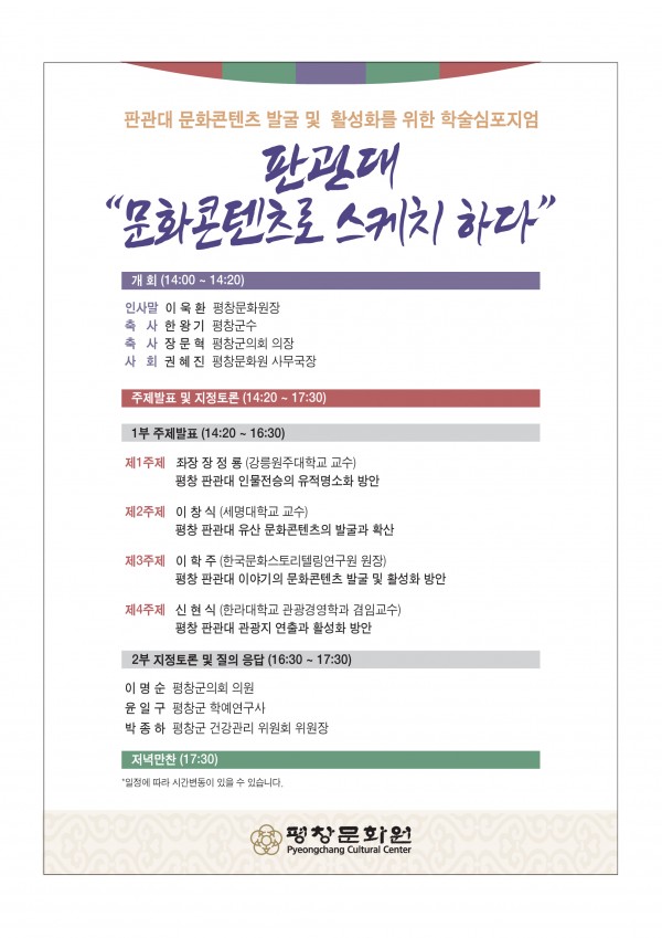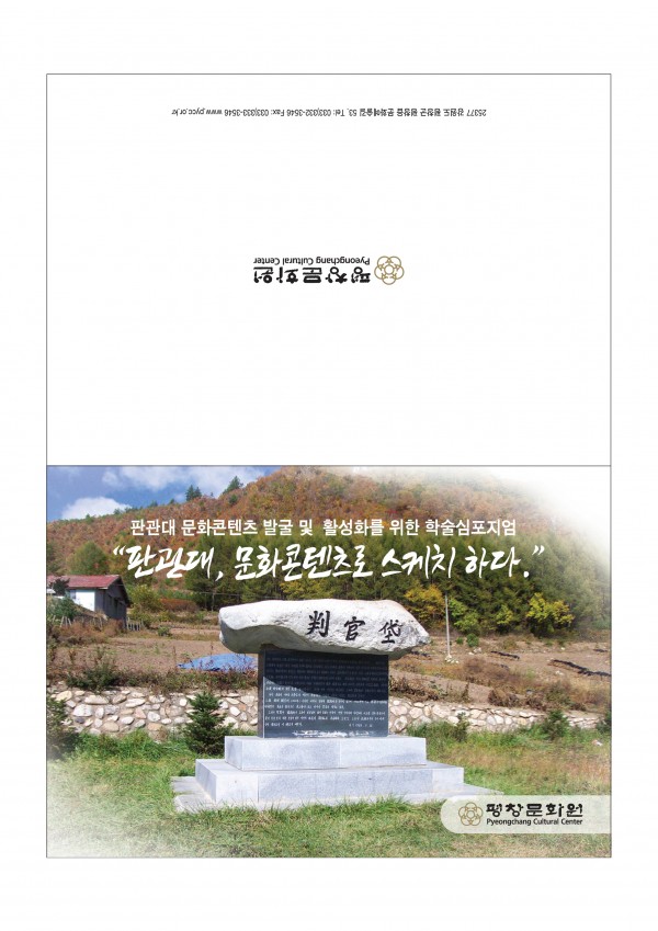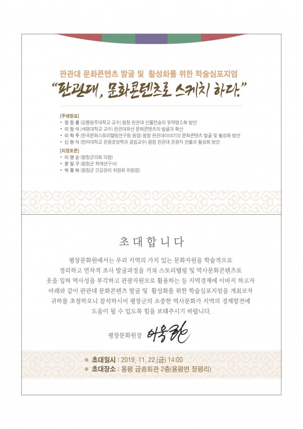 판관대, 문화콘텐츠 발굴 및 활성화를 위한 학술심포지엄 개최 안내 페이지 정보 작성자 평창문화원 작성일19-10-31 09:20 조회3,898회 댓글0건 이전글 다음글 목록 본문 댓글목록 등록된 댓글이 없습니다. 이전글 다음글 목록