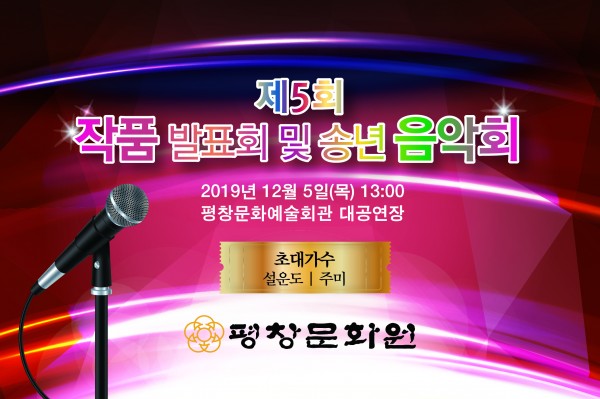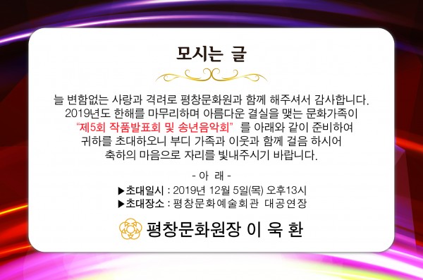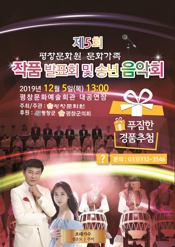 평창문화원 문화가족 작품발표회 및 송년음악회 알림 페이지 정보 작성자 평창문화원 작성일19-11-26 14:33 조회3,913회 댓글0건 이전글 다음글 목록 본문 댓글목록 등록된 댓글이 없습니다. 이전글 다음글 목록