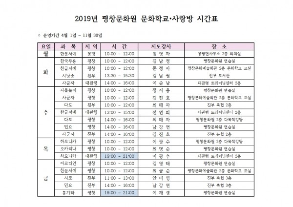 <2019 평창문화원 문화학교 사랑방 수업 일정표> 페이지 정보 작성자 평창문화원 작성일19-03-22 17:43 조회3,901회 댓글0건 이전글 다음글 목록 본문 2019 평창문화원 문화학교 사랑방 수업 일정표입니다. 수강생분들께서는 수업 받으시는데 차질 없도록 숙지하여주시면 감사하겠습니다. 댓글목록 등록된 댓글이 없습니다. 이전글 다음글 목록