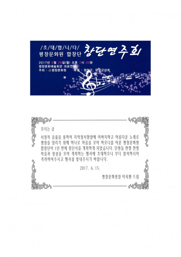 평창문화원합창단 창단연주회에 초대합니다. 페이지 정보 작성자 평창문화원 작성일17-06-15 11:12 조회3,737회 댓글0건 이전글 다음글 목록 본문 사진을 클릭하면 큰 이미지를 보실 수 있습니다. 댓글목록 등록된 댓글이 없습니다. 이전글 다음글 목록