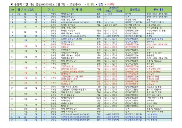 올림픽 기간 전통민속예술공연 알림 페이지 정보 작성자 평창문화원 작성일18-01-14 11:38 조회3,624회 댓글0건 이전글 다음글 목록 본문 공연표를 클릭하시면 확대하여 보실 수 있습니다. 많은 관람과 홍보 바랍니다. 댓글목록 등록된 댓글이 없습니다. 이전글 다음글 목록