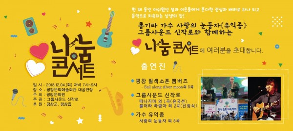 <나눔콘서트>에 초대합니다. 페이지 정보 작성자 평창문화원 작성일18-11-08 15:42 조회3,688회 댓글0건 이전글 다음글 목록 본문 시간 되시는 분들께서는 함께 하시어 많은 관람 부탁드립니다. 댓글목록 등록된 댓글이 없습니다. 이전글 다음글 목록