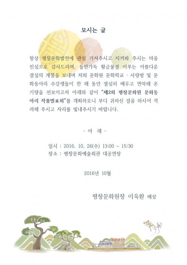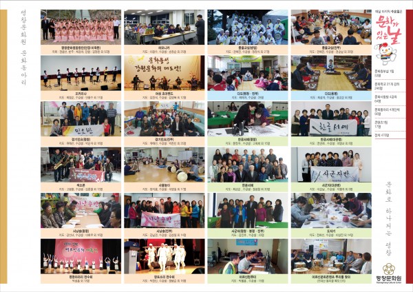 평창문화원 문화동아리 작품발표회 개최 안내 페이지 정보 작성자 평창문화원 작성일16-10-19 14:15 조회3,705회 댓글0건 이전글 다음글 목록 본문 제2회 평창문화원 문화학교.문화동아리 및 문화동아리 작품발표회에 초대합니다. 댓글목록 등록된 댓글이 없습니다. 이전글 다음글 목록