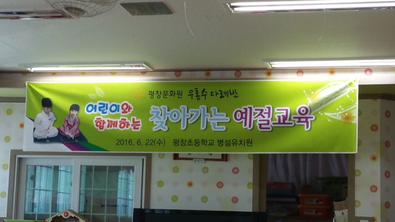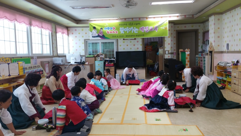 한국문화학교 | 찾아가는 예절교육 페이지 정보 작성자 평창문화원 작성일16-06-23 09:22 조회2,347회 댓글0건 이전글 다음글 목록 본문 2016. 06. 22(수) 평창문화원 우통수 다도반 선생님들이 평창초교 병성유치원 5~6세와 7세 원아를 대상으로 예절교육을 실시하였다.공수예절과 절하는 법차예절 등에 대하여 실시 어린이들의 표정이 매우 진지했다. 댓글목록 등록된 댓글이 없습니다. 이전글 다음글 목록