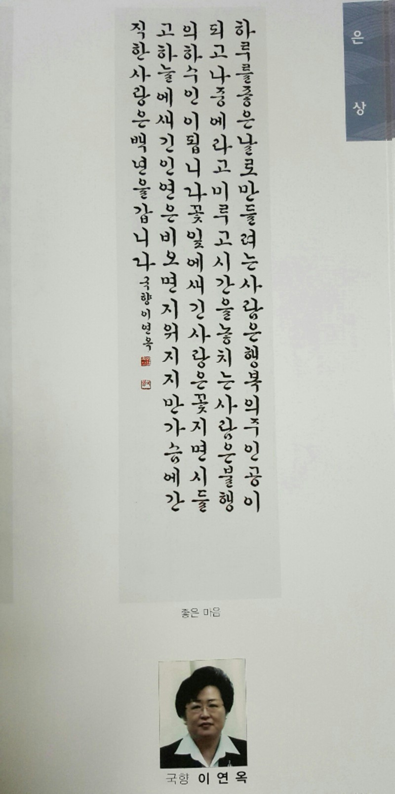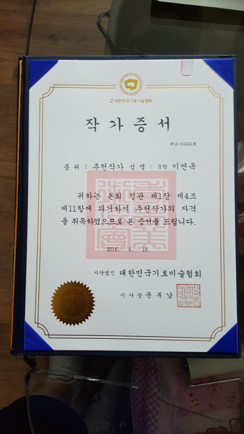 문화원 | 이연옥 이사님 작가자격 취득 페이지 정보 작성자 평창문화원 작성일16-06-07 13:13 조회2,541회 댓글0건 이전글 다음글 목록 본문 평창문화원 한글서예 수강생이신평창문화원 이연옥 이사님국제대회 및 전국 대회 수차례 우수한 성적을 거두어한글서예 작가 자격 취득 진심으로 축하드립니다. 댓글목록 등록된 댓글이 없습니다. 이전글 다음글 목록