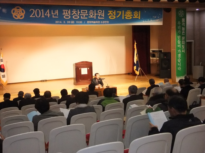 2014. 2. 28. 금요일 문화원임원 및 회원들과 함께 평창문화원 정기총회를 열었습니다. 정기총회에는 위촉장 및 감사패수여와 의안심의를 했습니다.