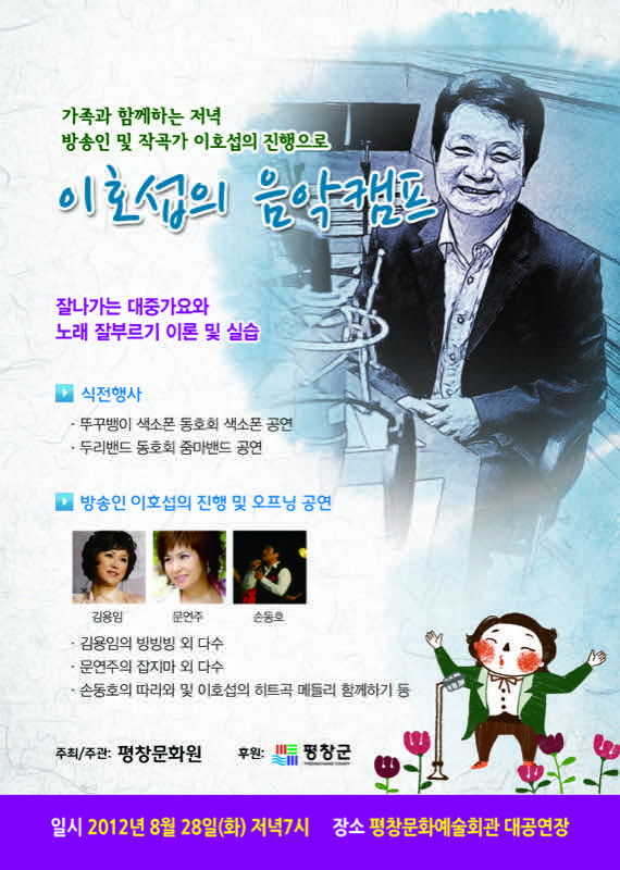 2012. 8. 28. 저녁7시 평창문화예술회관 대공연장에서 가족과 함께하는 저녁 이호섭의 음악캠프를 개최합니다. 바쁜 일상생활에서 벗어나 김용임, 문연주, 신동호 외 이호섭의 히트곡 메들리 함께하기 등 유명 가수들과 함께 음악회를 즐길 수 있는 자리를 마련하여 군민들에게 다양한 볼거리를 제공하니 군민들의 많은 참여바랍니다.