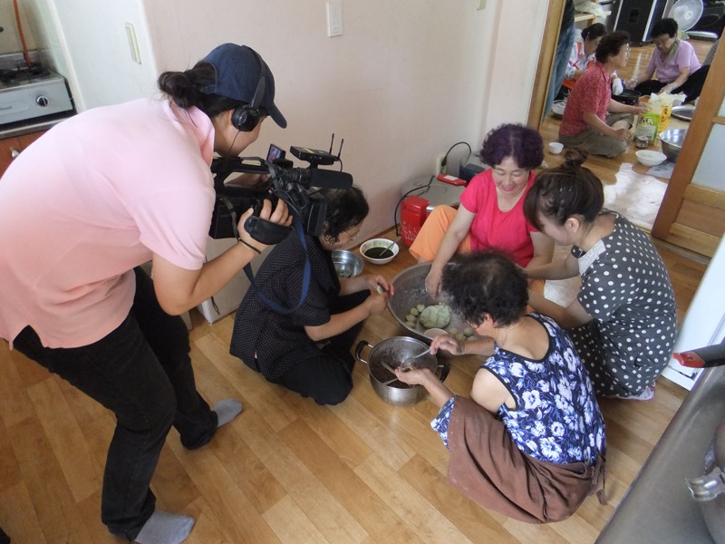 오늘은 특별히 한방건강TV에서 취재를 나오셨습니다. 뽕을 주제로 한 음식으로 뽕가루로 반죽을 해서 송편을 빚었습니다.
