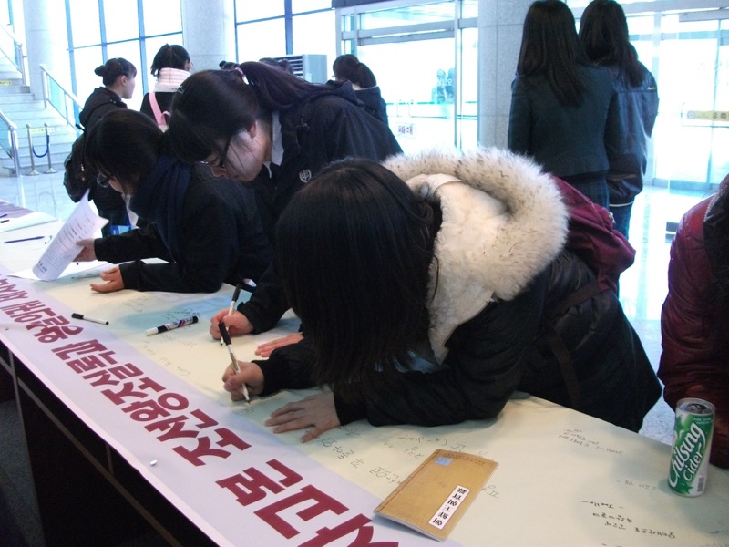 2010.12.9.목요일 평창고교 학생과 교사 300여명은 사인벨트에 `원래 있던 곳으로 우리의 보물을 되돌려달라'는 글을 남기는 등 지역의 소중한 문화재가 원소장처인 오대산 사고로 돌아오기를 염원했다.