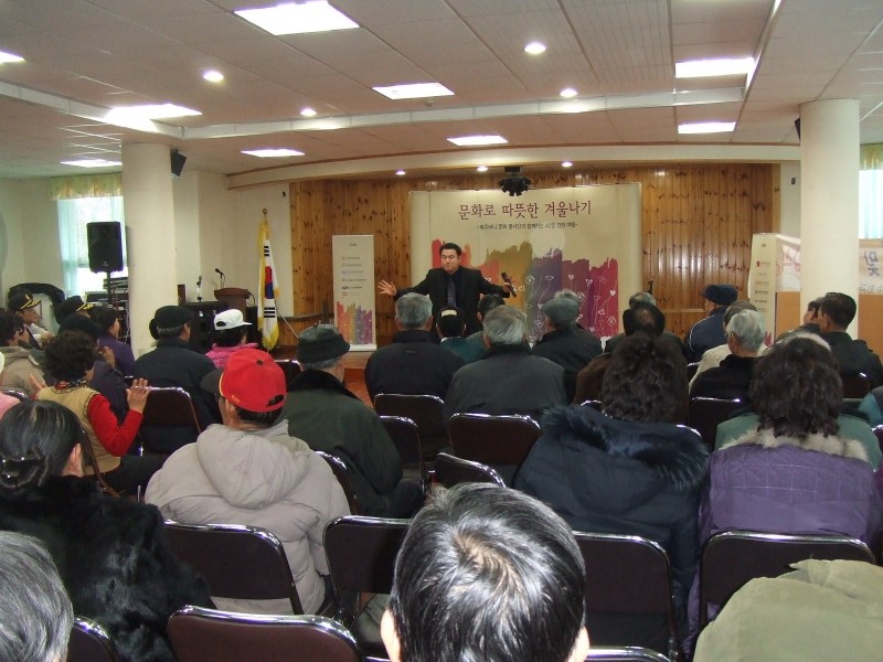 2009.1.21.수요일 장평 노인회관에서 문화봉사단과 함께하는 복주머니 행사를 하였습니다. 무용과 민요, 웃음치료 등 어르신들께서 너무나 즐거워하셨답니다. 많은 인원이 참석한 가운데 복주머니 행사는 의미있게 마쳤습니다.