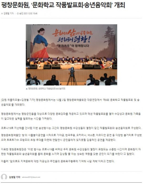 언론보도 스크랩 | 평창문화원,제6회 '문화학교 작품발표회, 송년음악회'개최 페이지 정보 작성자 평창문화원 작성일21-12-03 16:17 조회3,121회 댓글0건 이전글 다음글 목록 본문 평창문화원,제6회 '문화학교 작품발표회, 송년음악회'개최 댓글목록 등록된 댓글이 없습니다. 이전글 다음글 목록