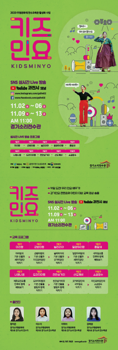 2020년도 무형문화재 전수교육관활성화사업 SNS실시간 라이브방송 ‘키즈민요 KIDSMINYO’ 페이지 정보 작성자 전은정 작성일20-10-26 10:52 조회1,915회 댓글0건 이전글 다음글 목록 본문 1 댓글목록 등록된 댓글이 없습니다. 이전글 다음글 목록