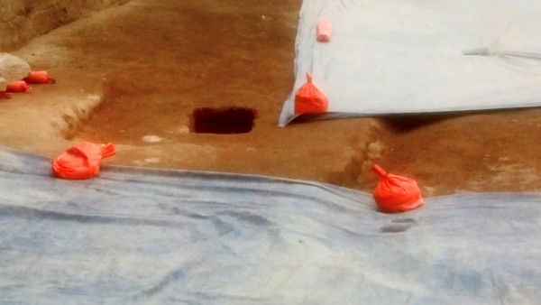 평창 하리 청동기유물 발굴현장으로 왼쪽 위의 청색 포장을 들추니 호박돌 축벽의 매장지가 있으며, 그 위에 두께