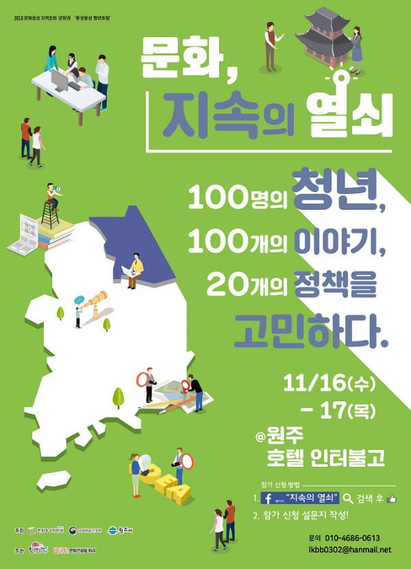 문화융성위원회가 주관하고 원주문화재단이 주최하는 `융성웅성 청년포럼'이 16~17일 인터불고호텔 원주에서 `문화, 미래를 여는 열쇠'를 주제로 열립니다.